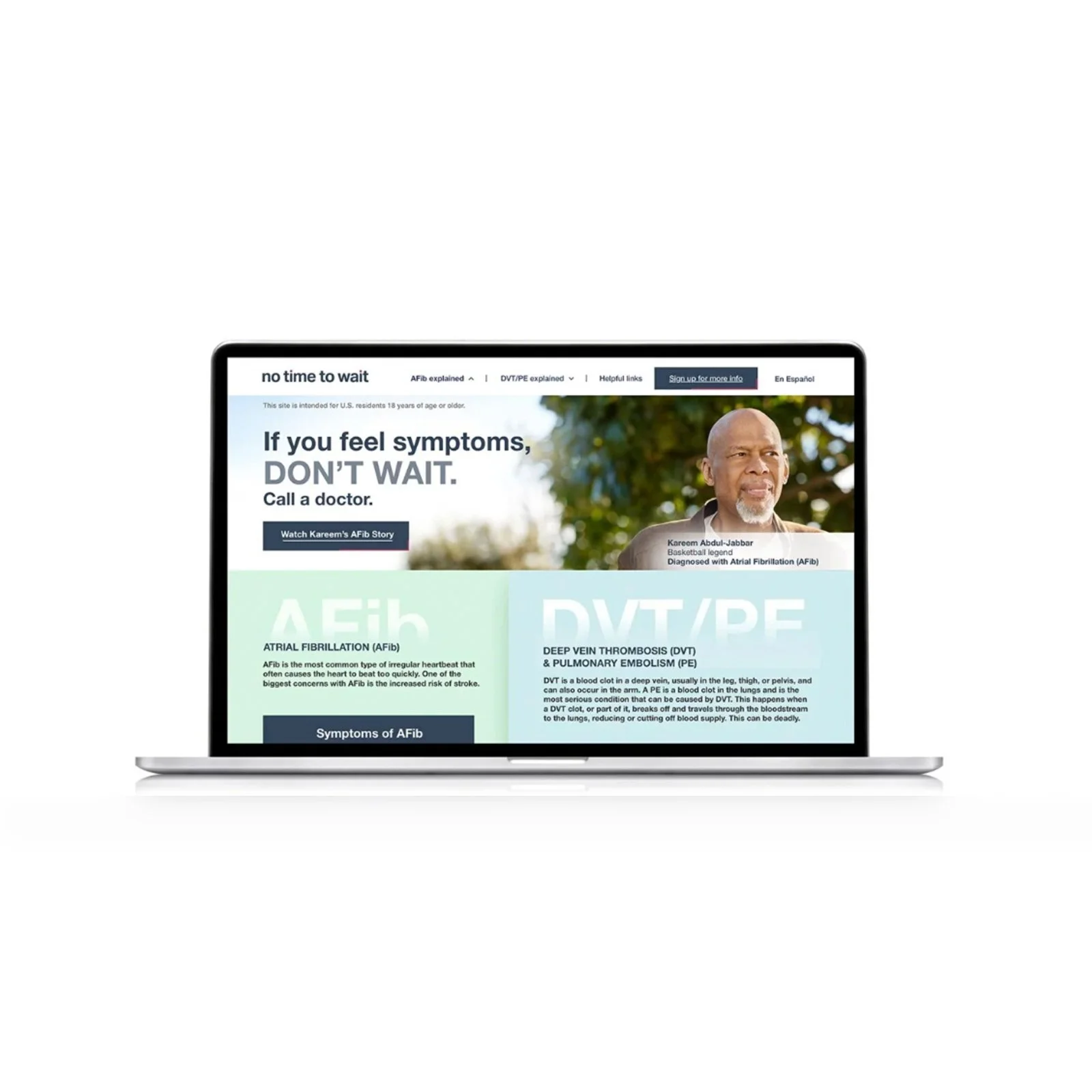 I led the full design and UX evolution of the unbranded AFib awareness site, beginning with the original launch featuring Kareem Abdul-Jabbar. When the spokesperson partnership concluded, I shifted the site to a patient-focused experience by replacing celebrity visuals with authentic patient stories and reworking the layout to feel more personal, accessible, and emotionally engaging. I refreshed the site architecture, imagery, and user flow to align with the updated creative strategy, ensuring the experience supported education and patient action.
