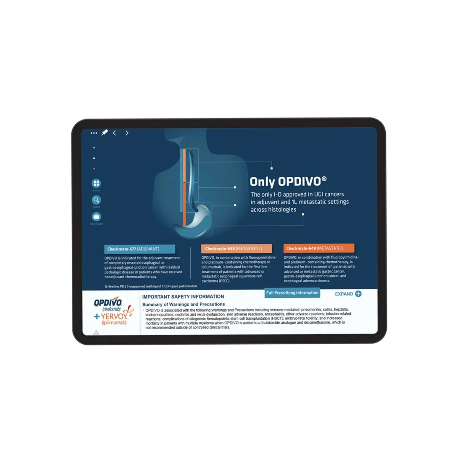I designed the templates and visual framework for iPad sales aids across Opdivo, Eliquis, and Kinharto. Collaborating closely with Medical Directors, I transformed complex clinical data into clear, impactful charts and infographics while navigating limited space and strict medical, legal, and regulatory guidelines. The resulting pieces are polished, flexible, and user-friendly, enabling sales reps to communicate key messages efficiently and effectively during brief interactions
